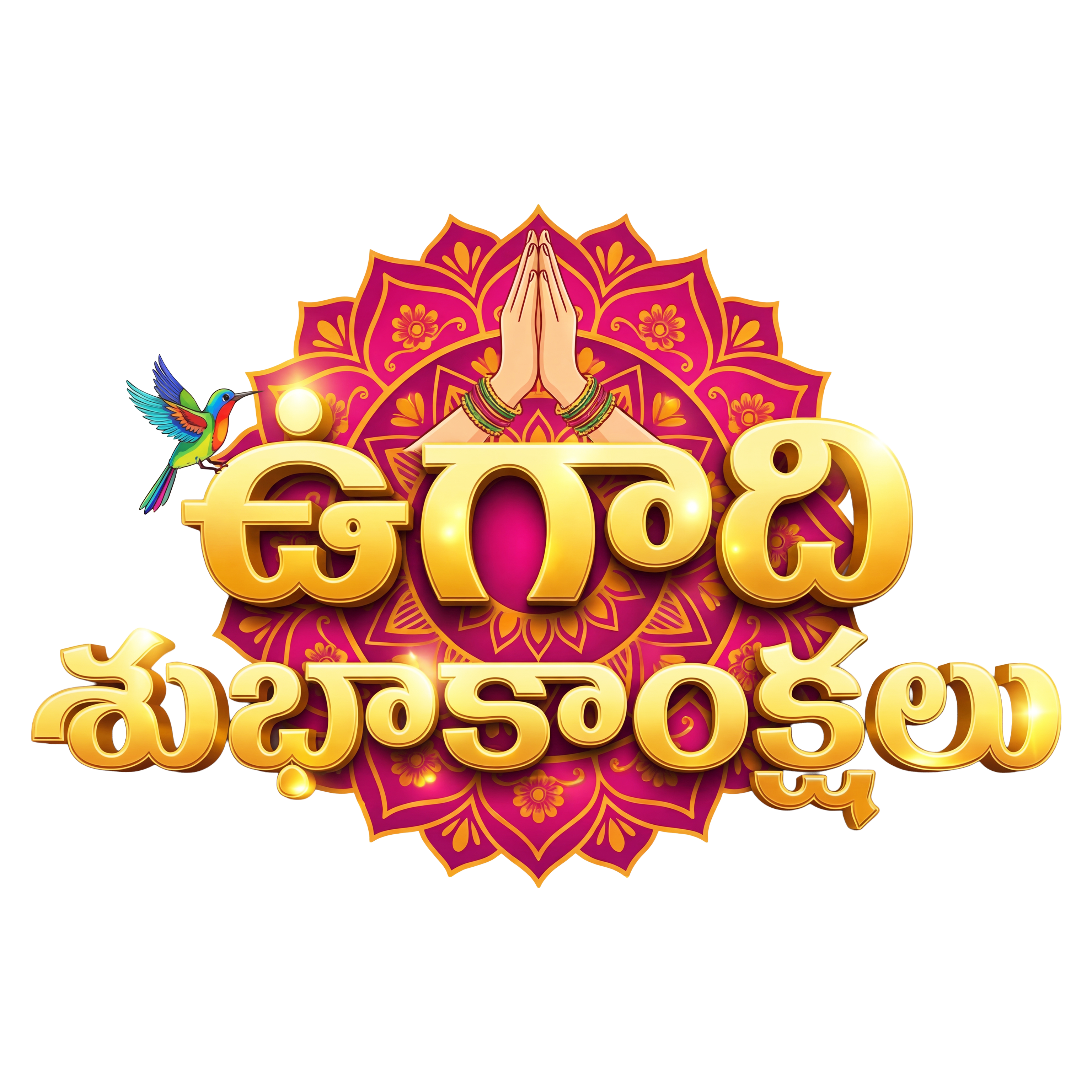 Ugadi Shubhakankshalu Telugu typography PNG features a vibrant festive design with bold golden Telugu lettering placed on a decorative mandala background. The design highlights the Telugu greeting ఉగాది శుభాకాంక్షలు, which means heartfelt Ugadi wishes for the Telugu New Year celebration.